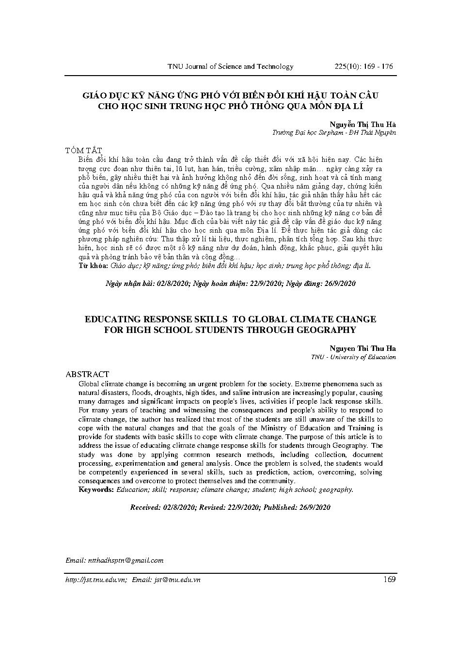 GIÁO DỤC KỸ NĂNG ỨNG PHÓ VỚI BIẾN ĐỔI KHÍ HẬU TÒAN CẦU CHO HỌC SINH TRUNG HỌC PHỔ THÔNG QUA MÔN ĐỊA LÍ = EDUCATING RESPONSE SKILLS TO GLOBAL CLIMATE CHANGE FOR HIGH SCHOOL STUDENTS THROUGH GEOGRAPHY
