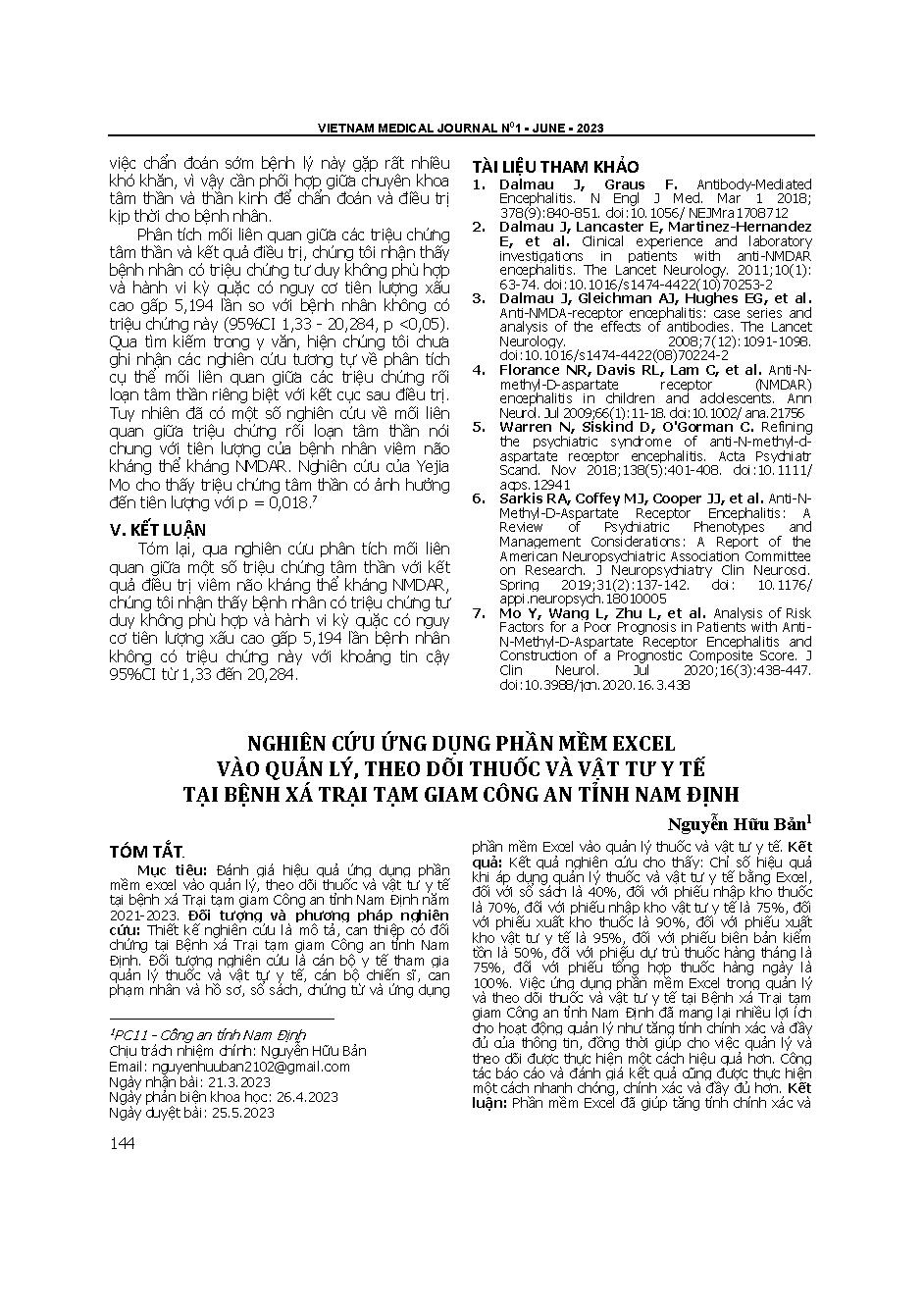 Nghiên cứu ứng dụng phần mềm excel vào quản lý, theo dõi thuốc và vật tư y tế tại Bệnh xá Trại tạm giam Công an tỉnh Nam Định = Research on the application of excel software in management, tracking of drugs and medical supplies at prison infirmary - Nam D
