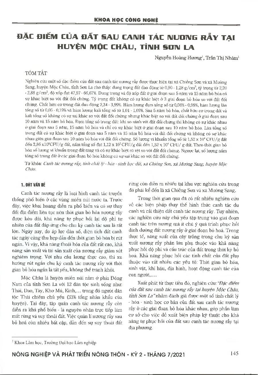 Đặc điểm của đất sau canh tác nương rẫy tại huyện Mộc Châu, tỉnh Sơn La
