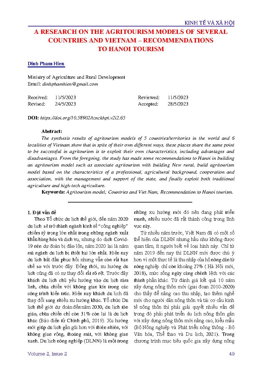 Nghiên cứu các mô hình du lịch nông nghiệp của một số nước và Việt Nam - các khuyến nghị đối với du lịch Hà Nội = A research on the agritourism models of several countries and Vietnam – recommendations to Hanoi tourism