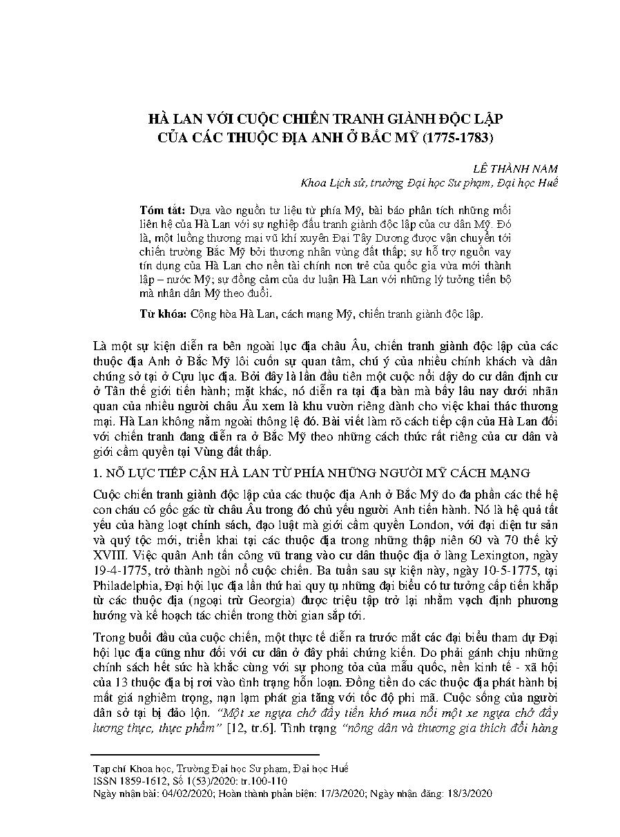 Hà Lan với cuộc chiến tranh giành độc lập của các thuộc địa Anh ở Bắc Mỹ (1775-1783) = The Dutch republic toward the American war for independence in the period of 1775-1783