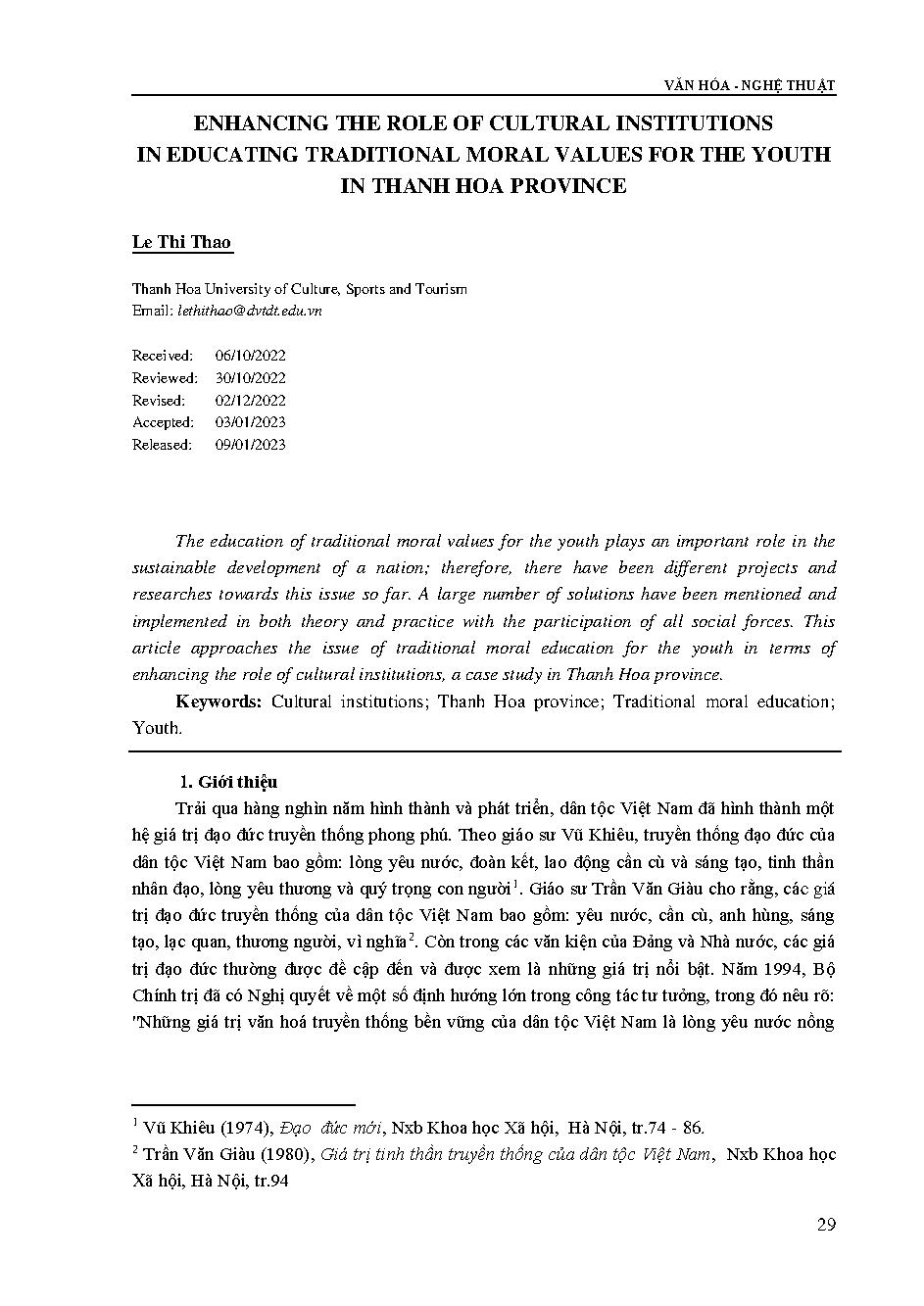 Nâng cao vai trò của thiết chế văn hóa trong giáo dục giá trị đạo đức truyền thống cho thanh niên tỉnh Thanh Hóa = Enhancing the role of cultural institutions in educating traditional moral values for the youth in Thanh Hoa province