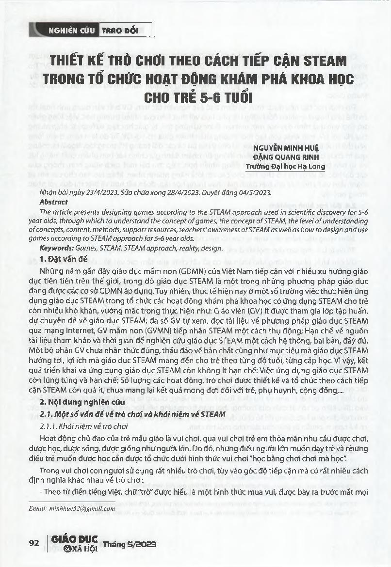 Thiết kế trò chơi theo cách tiếp cận STEAM trong tổ chức hoạt động khám phá khoa học cho trẻ 5-6 tuồi = Designing games according to the STEAM approach in organizing scientific discovery activities for 5-6 year olds.