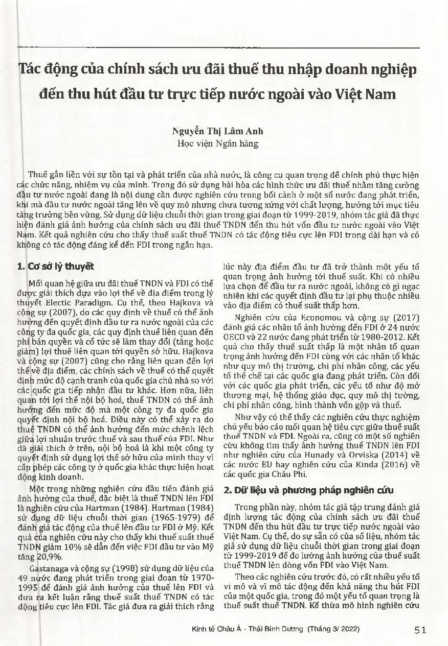 Tác động của chính sách ưu đãi thuế thu nhập doanh nghiệp đến thu hút đầu tư trực tiếp nước ngoài vào Việt Nam