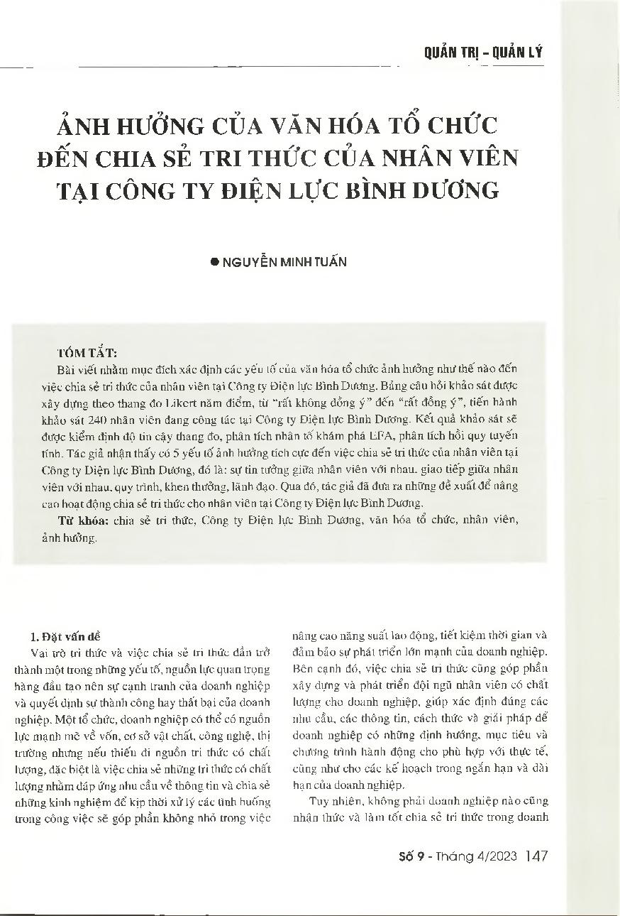 Ảnh hưởng của văn hóa tổ chức đến chia sẻ tri thức của nhân viên tại công ty Điện lực Bình Dương