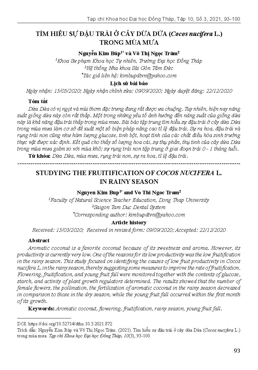 Tìm hiểu sự đậu trái ở cây dừa Dứa (Cocos nucifera L.) trong mùa mưa = Studying the fruitification of cocos nucifera L. in rainy season