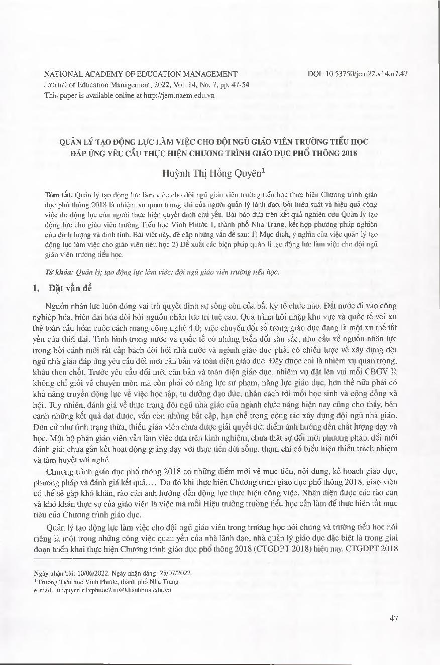 Quản lý tạo động lực làm việc cho đội ngũ giáo viên trường tiểu học đáp ứng yêu cầu thực hiện chương trình giáo dục phổ thông 2018 = Management of working motivation to meet requirements of general education program implementation in 2018