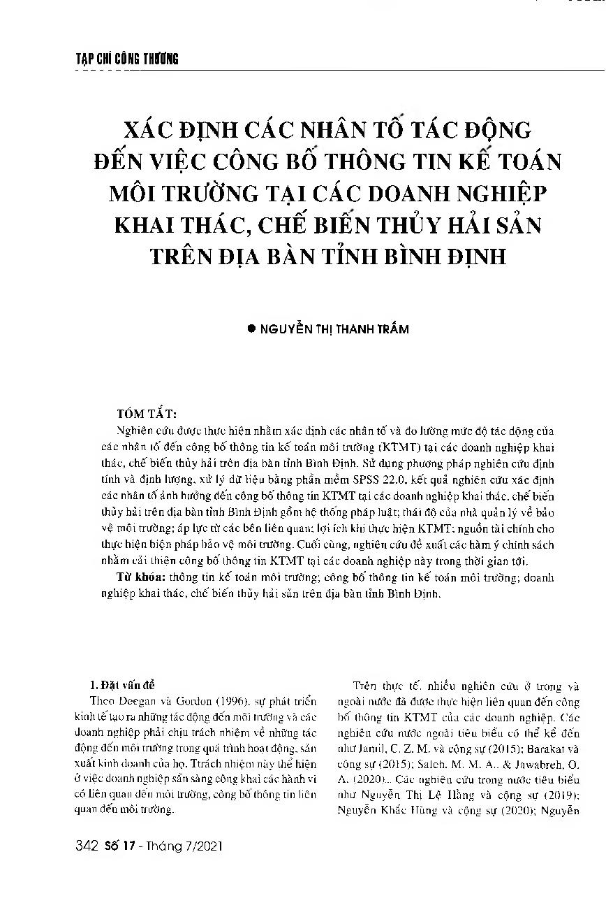 Xác định các nhân tố tác động đến việc công bố thông tin kế toán môi trường tại các doanh nghiệp khai thác, chế biến thủy hải sản trên địa bàn tỉnh Bình Định = Determining factors affecting the disclosure of environmental accounting information at fishing and seafood processing enterprises in Binh Dinh Province