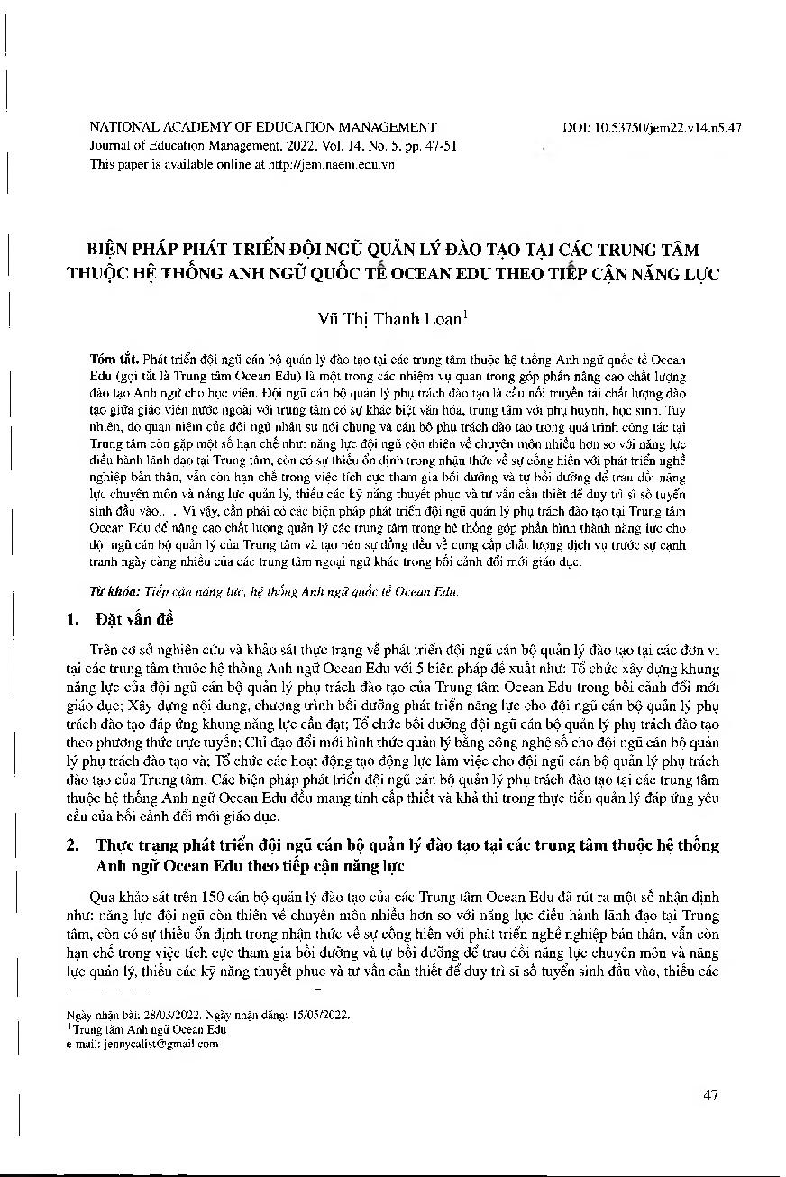 Biện pháp phát triển đội ngũ quản lý đào tạo tại các trung tâm thuộc hệ thống anh ngữ quốc tế Ocean Edu theo tiếp cận năng lực = Measures for developing management team in charge of training at centers by Ocean Edu International English System by access t