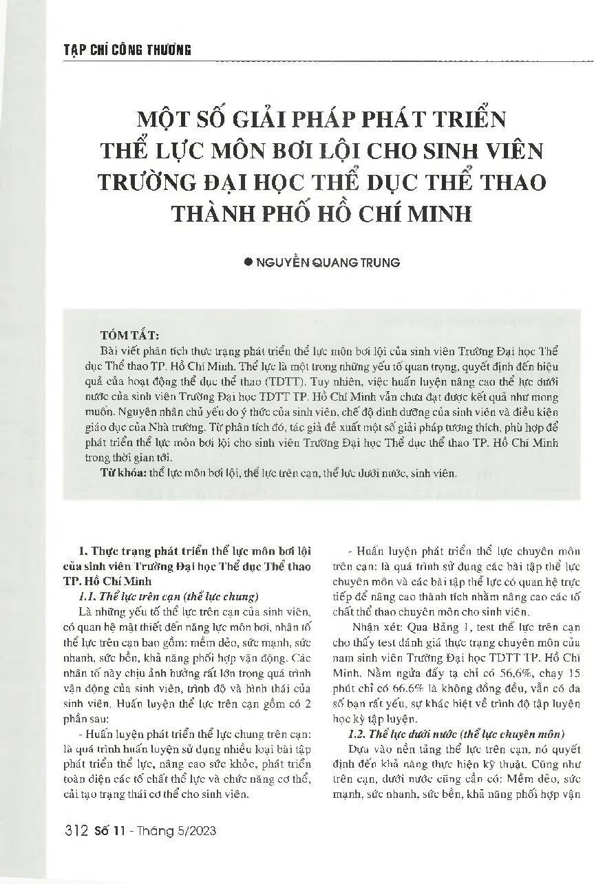 Một số giải pháp phát triển thể lực môn bơi lội cho sinh viên Trường Đại học Thể dục thể thao TP. Hồ Chí Minh