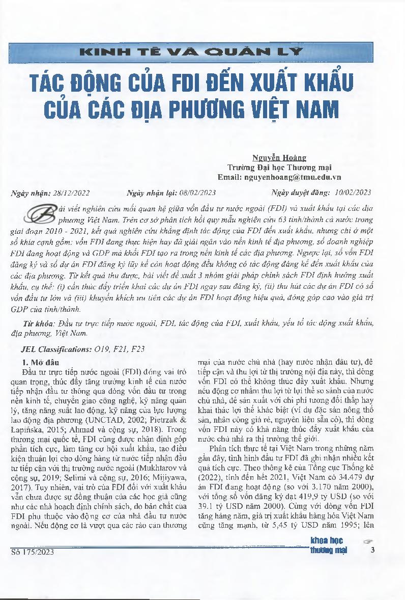 Tác động của FDI đến xuất khẩu của các địa phương Việt Nam = Effects of Foreign Direct Investment (FDI) on Export of Vietnamese Provinces