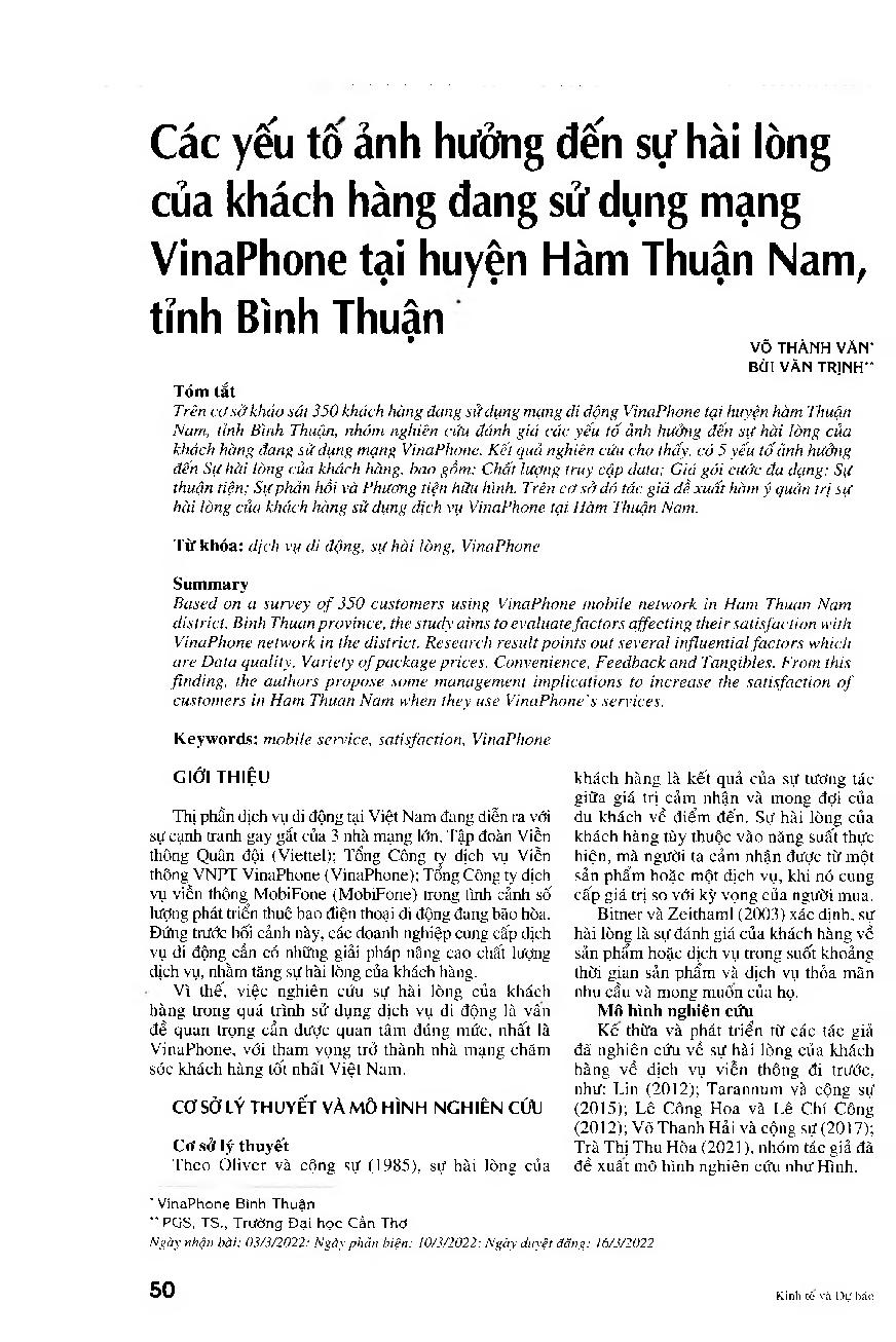 Các yếu tố ảnh hưởng đến sự hài lòng của khách hàng đang sử dụng mạng VinaPhone tại huyện Hàm Thuận Nam. tỉnh Bình Thuận = Factors impacting the satisfaction of customers using VinaPhone network in Ham Thuan Nam district, Binh Thuan province