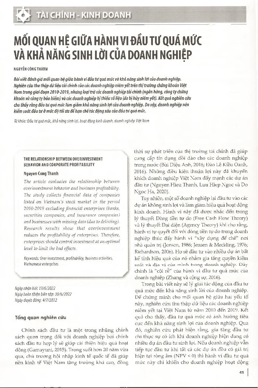 Tác động của dòng tiền tự do lên hiệu quả hoạt động của các doanh nghiệp xây dựng niêm yết trên sàn giao dịch chứng khoán Việt Nam = Impacts of the free cash flow on the performance of construction companies listed on the Vietnam&; 39;s stock market