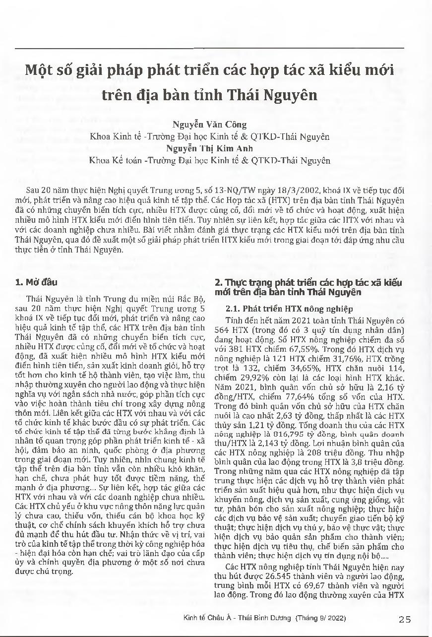 Một số giải pháp phát triển các hợp tác xã kiểu mới trên địa bàn tỉnh Thái Nguyên