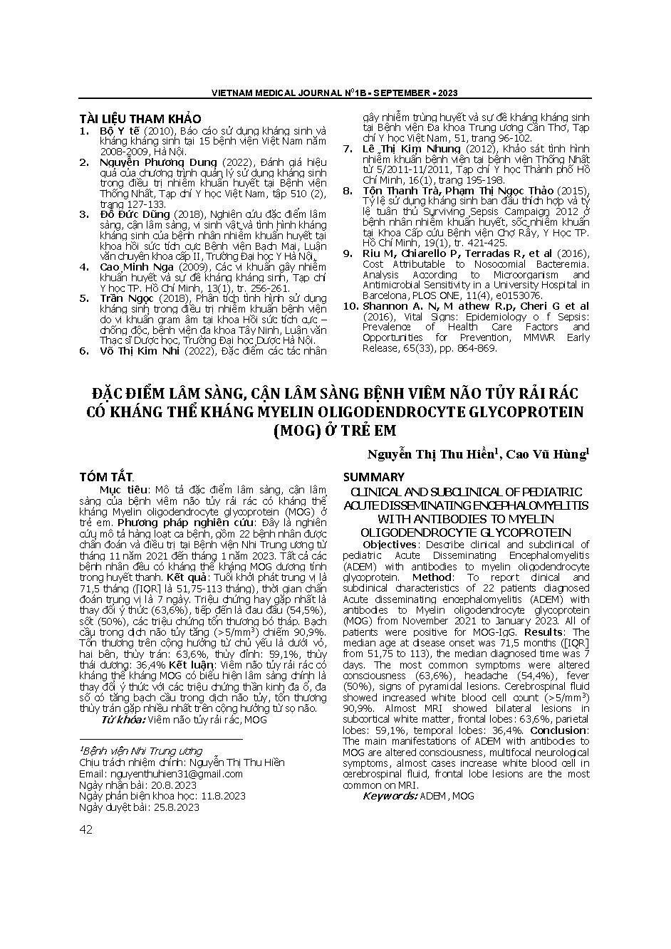 Đặc điểm lâm sàng, cận lâm sàng bệnh viêm não tủy rải rác có kháng thể kháng Myelin oligodendrocyte glycoprotein (MOG) ở trẻ em = Clinical and subclinical of pediatric acute disseminating encephalomyelitis with antibodies to Myelin oligodendrocyte glycopr
