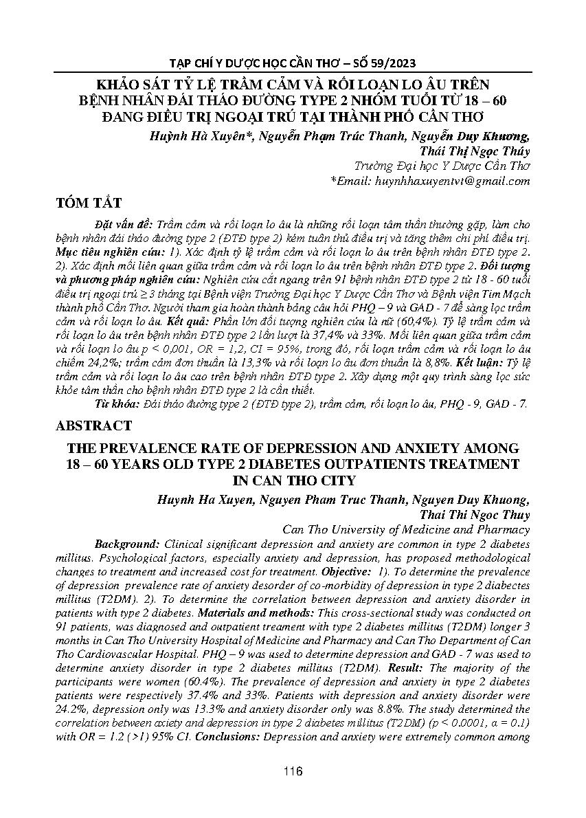 Khảo sát tỷ lệ trầm cảm và rối loạn lo âu trên bệnh nhân đái tháo đường type 2 nhóm tuổi từ 18 – 60 đang điều trị ngoại trú tại thành phố Cần Thơ