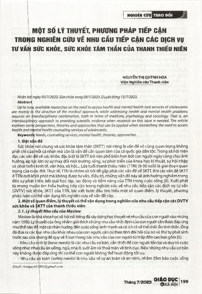 Một số lý thuyết, phương pháp tiếp cận trong nghiên cứu về nhu cầu tiếp cận các dịch vụ tư vấn sức khỏe, sức khỏe tâm thán của thanh thiếu niên = Some theories and research approaches on the need of adolescents accessing to health care and mental health c