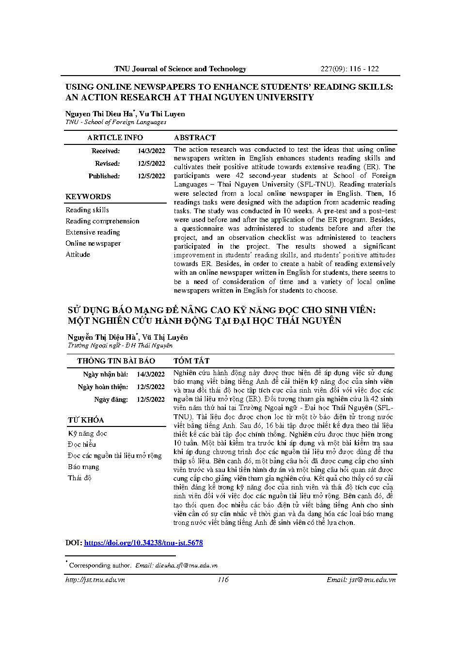 Sử dụng báo mạng để nâng cao kỹ năng đọc cho sinh viên: một nghiên cứu hành động tại đại học Thái Nguyên = Using online newspapers to enhance students’ reading skills: an action research at Thai Nguyen university