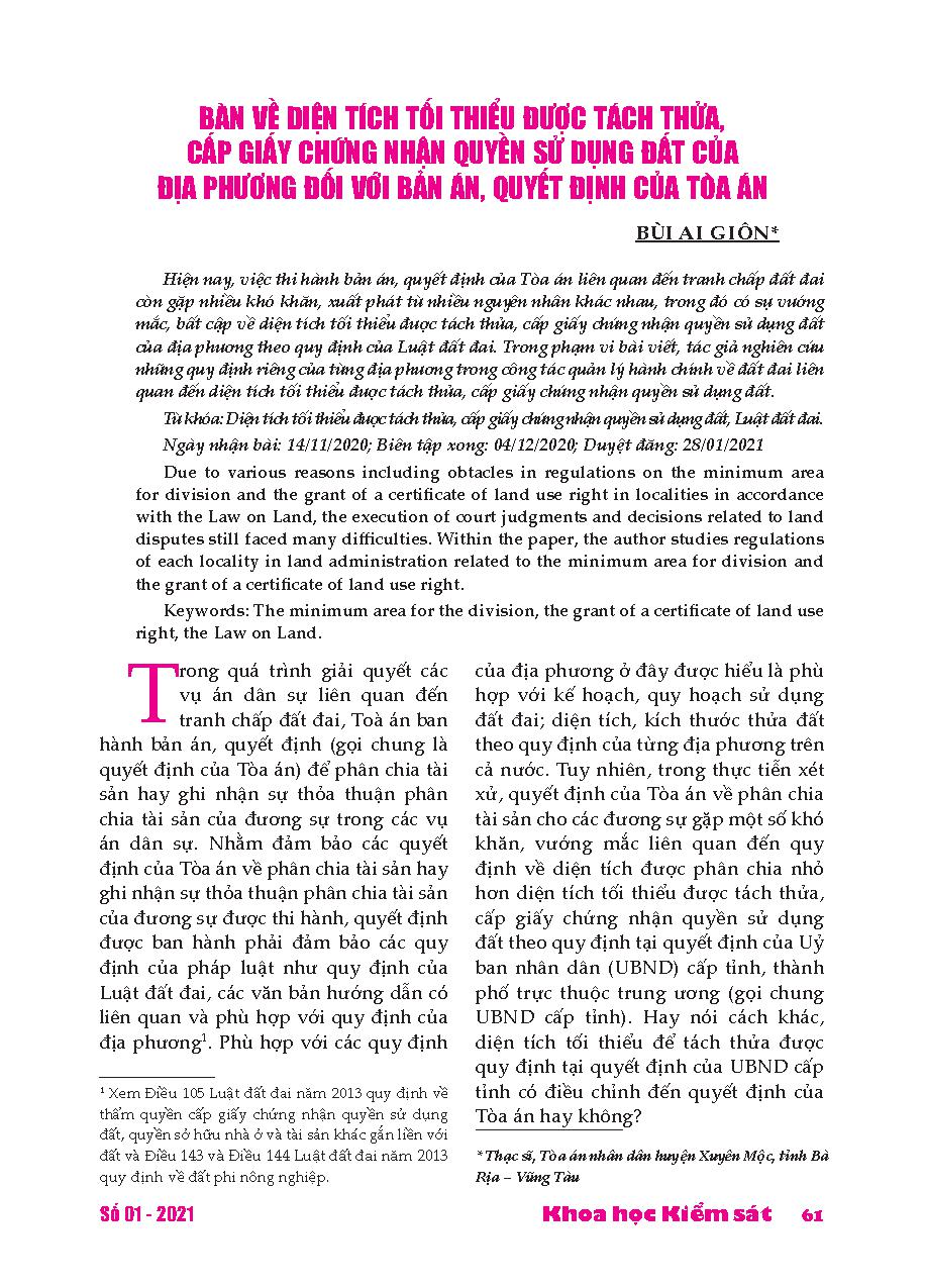 Bàn về diện tích tối thiểu được tách thửa, cấp giấy chứng nhận quyền sử dụng đất của địa phương đối với bản án, quyết định của Tòa án = Discussing the minimum area for splitting the parcel, granting the local land use right certificate to the court judgment or decision