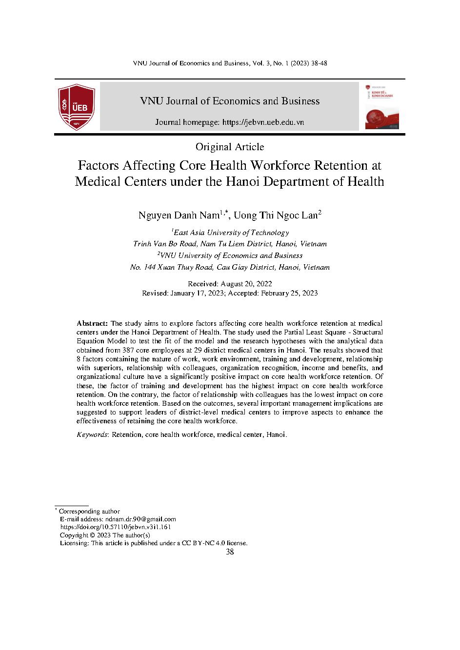 Các yếu tố ảnh hưởng đến duy trì đội ngũ nhân viên nòng cốt tại các trung tâm y tế trực thuộc Sở Y tế Hà Nội = Factors Affecting Core Health Workforce Retention at Medical Centers under the Hanoi Department of Health