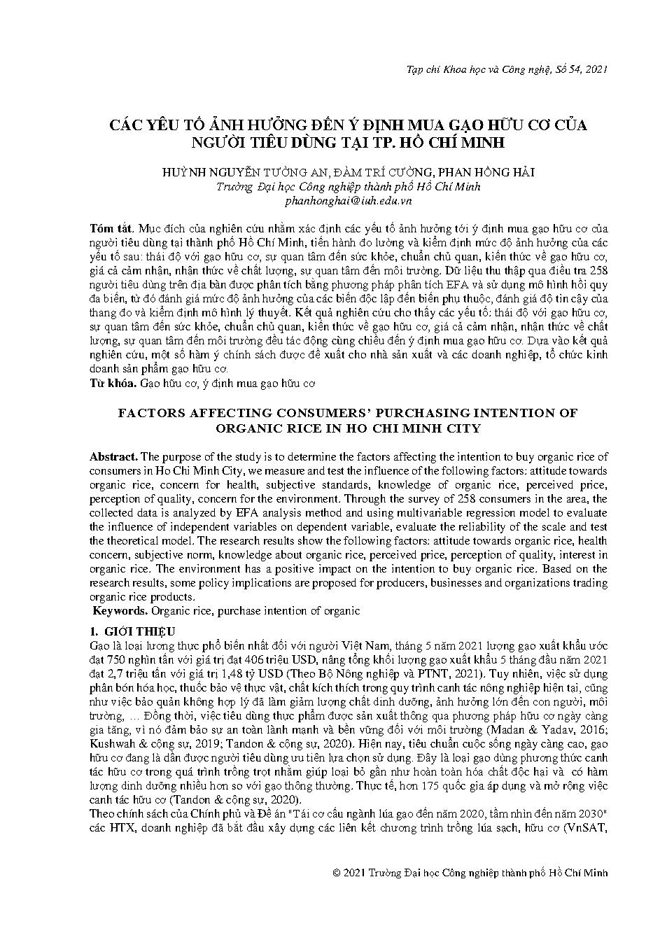 Các yếu tố ảnh hưởng đến ý định mua gạo hữu cơ của người tiêu dùng tại thành phố Hồ Chí Minh