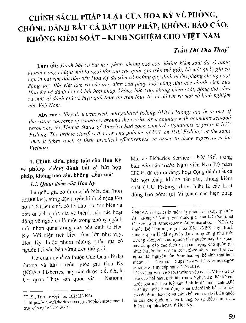 Chính sách, pháp luật của Hoa Kỳ về phòng, chống đánh bắt cá bất hợp pháp, không báo cáo, không kiểm soát - kinh nghiệm cho Việt Nam = US policies and laws on the prevention and control of illegal, unreported, uncontrolled fishing - experience for Vietnam