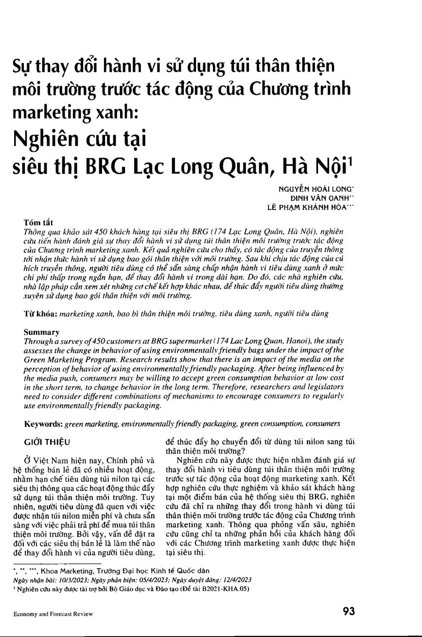 Sự thay đổi hành vi sử dụng túi thân thiện môi trường trước tác động của Chương trình marketing xanh: Nghiên cứu tại siêu thị BRG Lạc Long Quân, Hà Nội