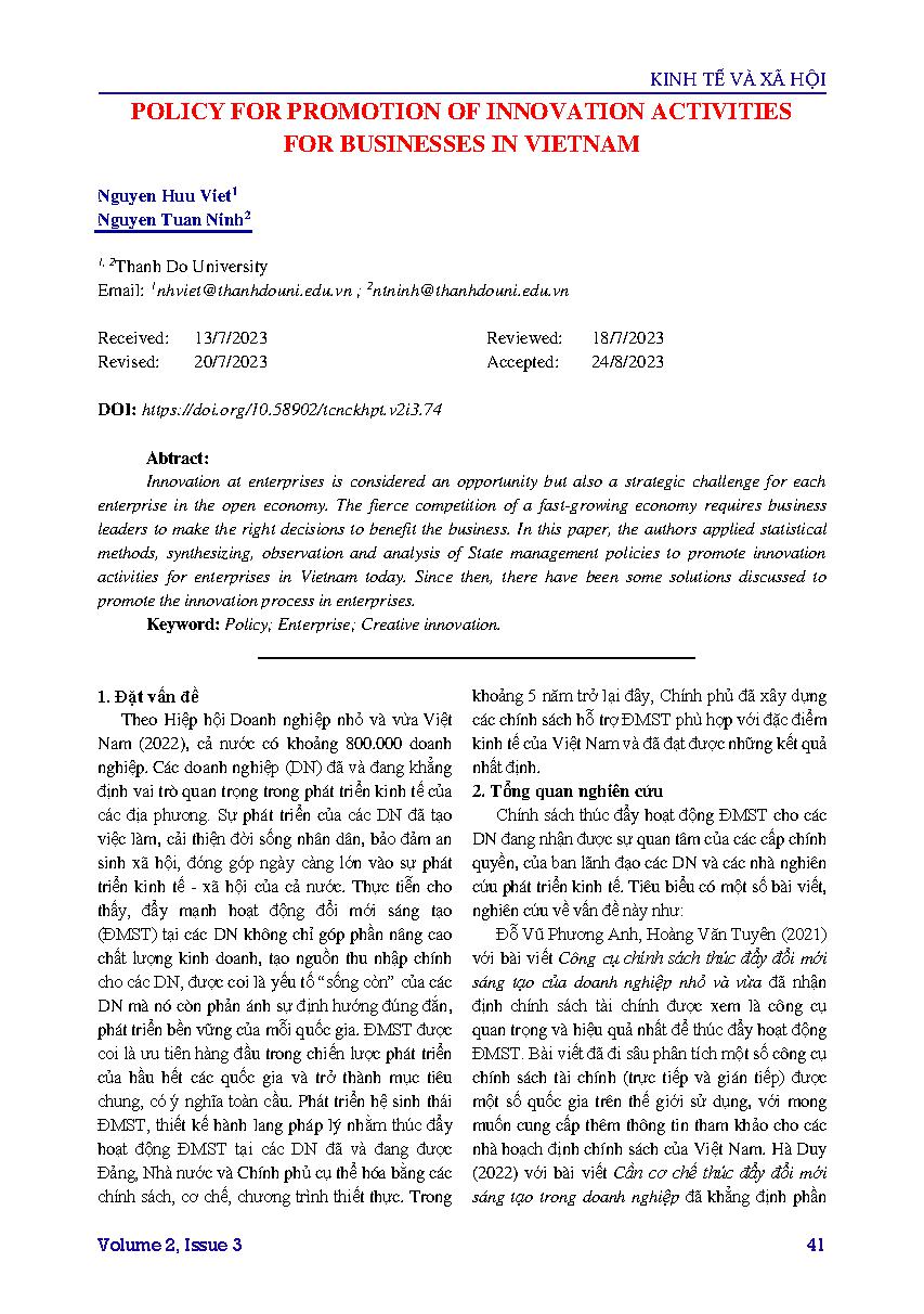 Chính sách thúc đẩy hoạt động đổi mới sáng tạo cho các doanh nghiệp tại Việt Nam hiện nay = Policy for promotion of innovation activities for businesses in Vietnam