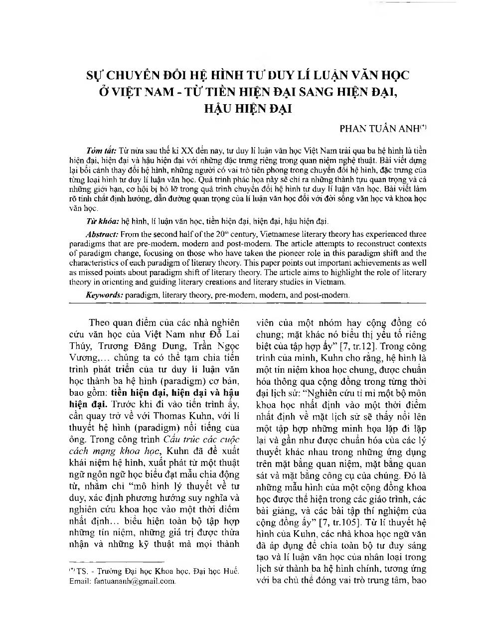 Sự chuyển đổi hệ hình tư duy lý luận văn học ở Việt Nam - từ tiền hiện đại sang hiện đại, hậu hiện đại = The shift of paradigm in literary theory thinking in Vietnam from pre-modem to modem and post-modern times