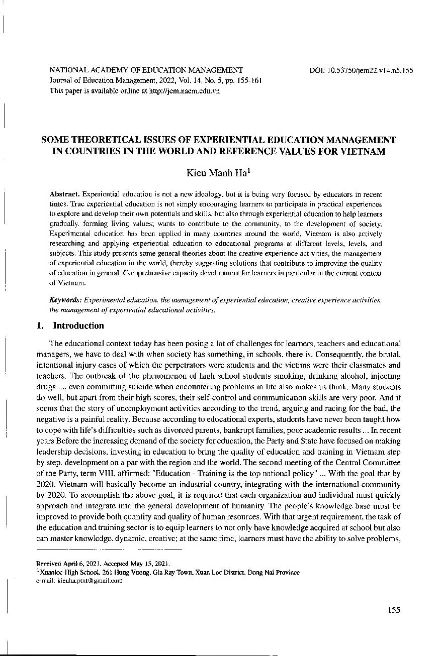 Một số vấn đề lý luận về quản lý giáo dục trải nghiệm ở các nước trên thế giới và giá trị tham khảo cho Việt Nam = Some theoretical issues of experiential education management in countries in the world and reference values for vietnam