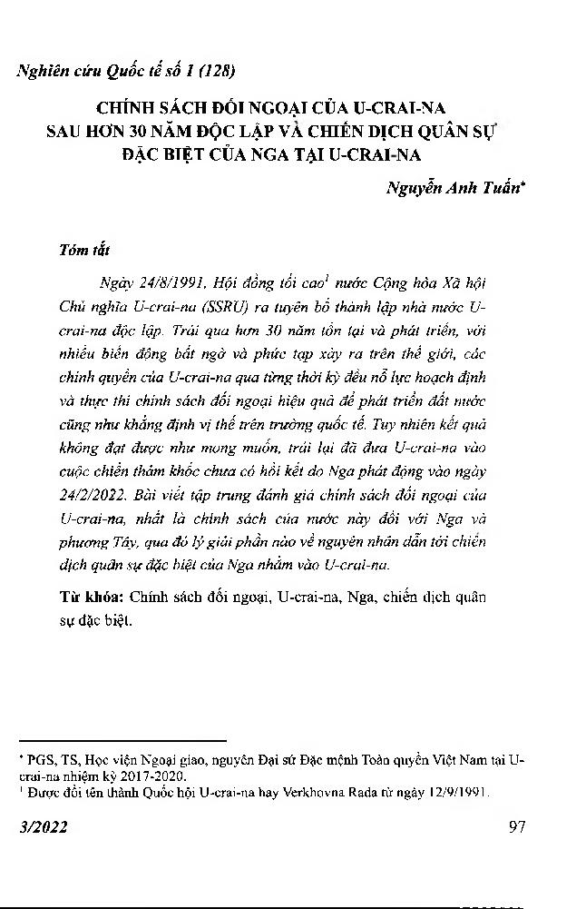 Chính sách đối ngoại của U-crai-na sau hơn 30 năm độc lập và chiến dịch quân sự đặc biệt của Nga tại U-crai-na = Ukraine’s Foreign Policy in Thirty Years since Independence and the Current Russia’s Special Military Operation in Ukraine