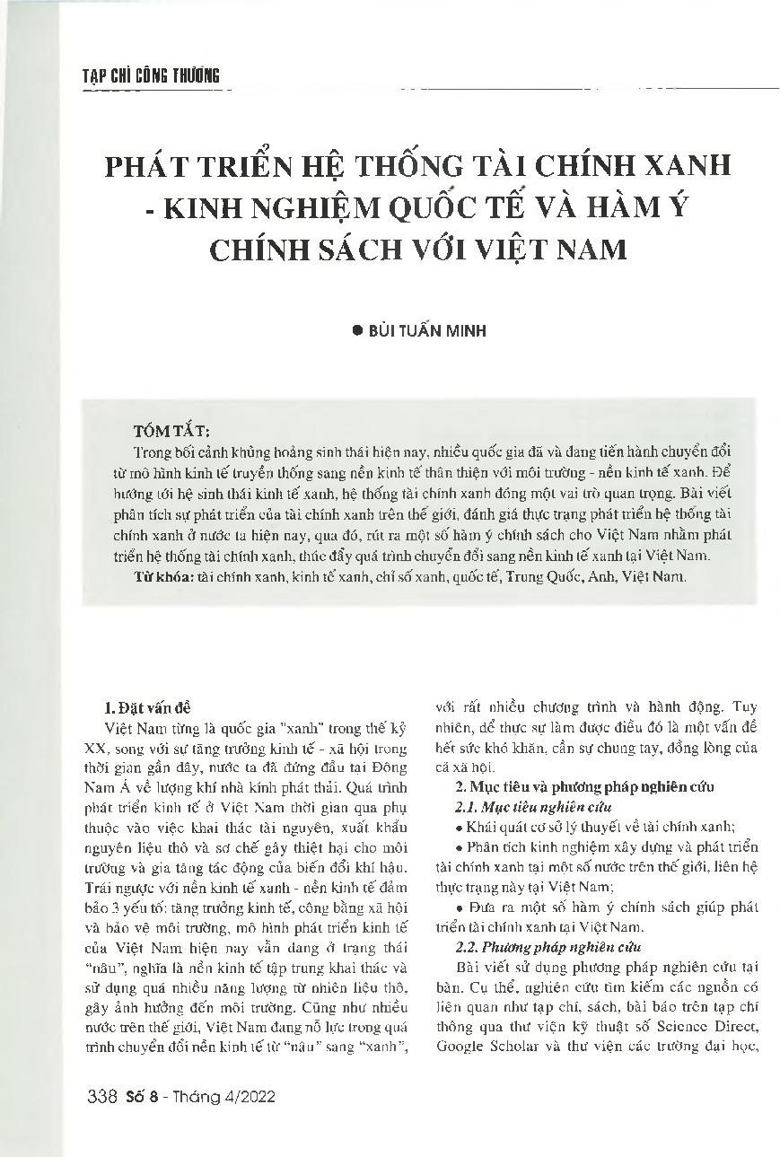 Phát triển hệ thống tài chính xanh - Kinh nghiệm quốc tế và hàm ý chính sách với Việt Nam = Developing a green financial system - International experiences and policy implications for Vietnam