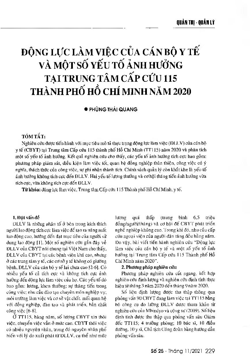 Động lực làm việc của cán bộ y tế và một số yếu tố ảnh hưởng tại Trung tâm cấp cứu 115 Thanh phố Hồ Chí Minh năm 2020 = Factors affecting the working motivation of health workers at the Ho Chi Minh City 115 Emergency Center in 2020