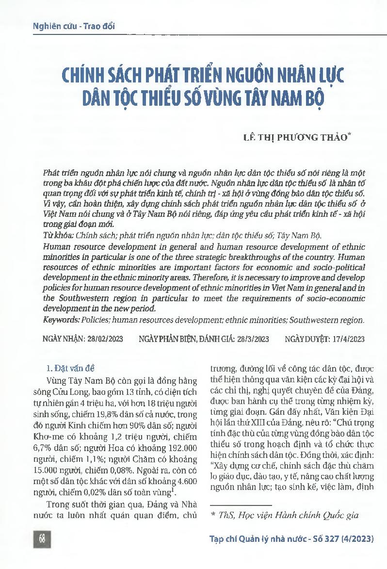 Chính sách phát triển nguồn nhân lực dân tộc thiểu số vùng Tây Nam Bộ = Policy for developing ethnic minority human resources in the Southwest region