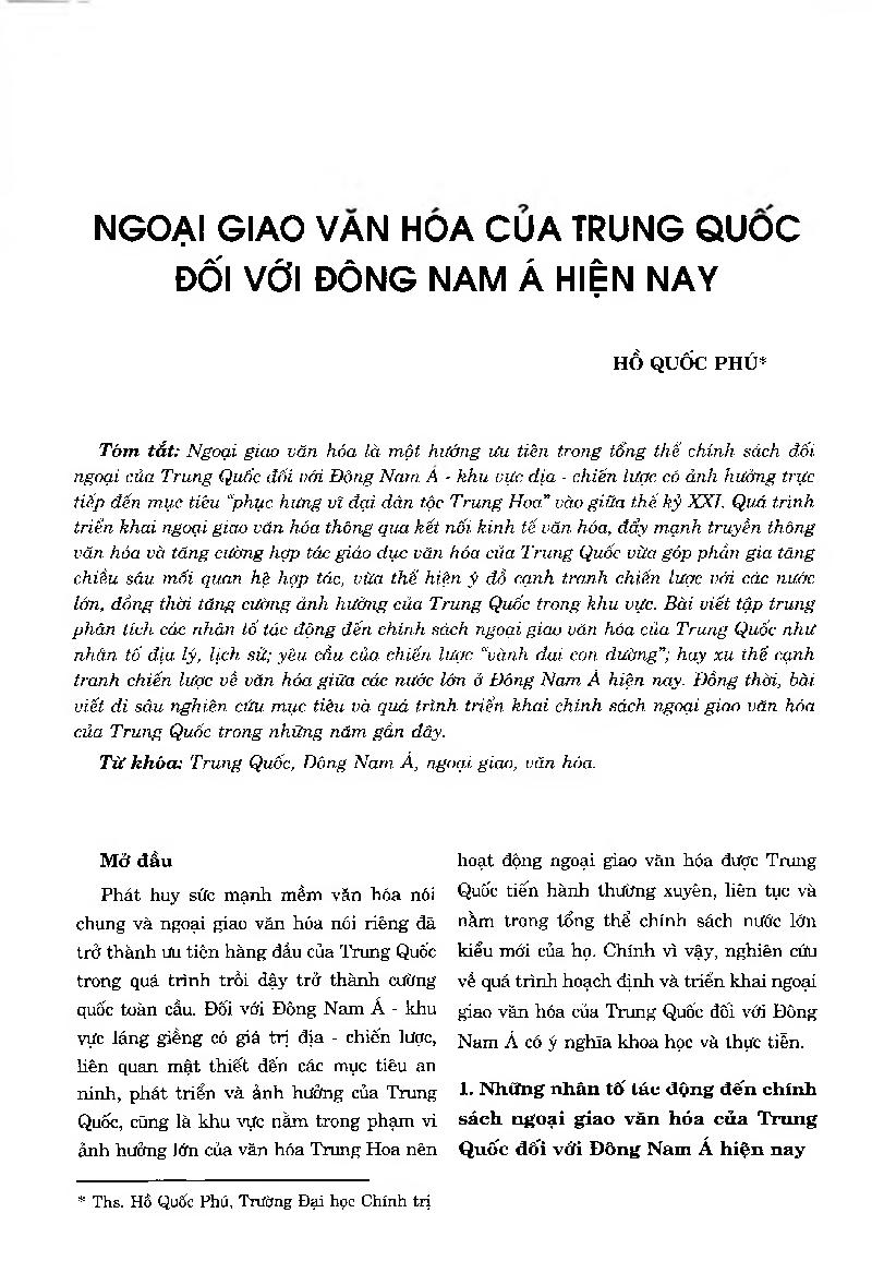 Ngoại giao văn hóa của Trung Quốc đối với Đông Nam Á hiện nay = China’s Cultural Diplomacy in Southeast Asia Today