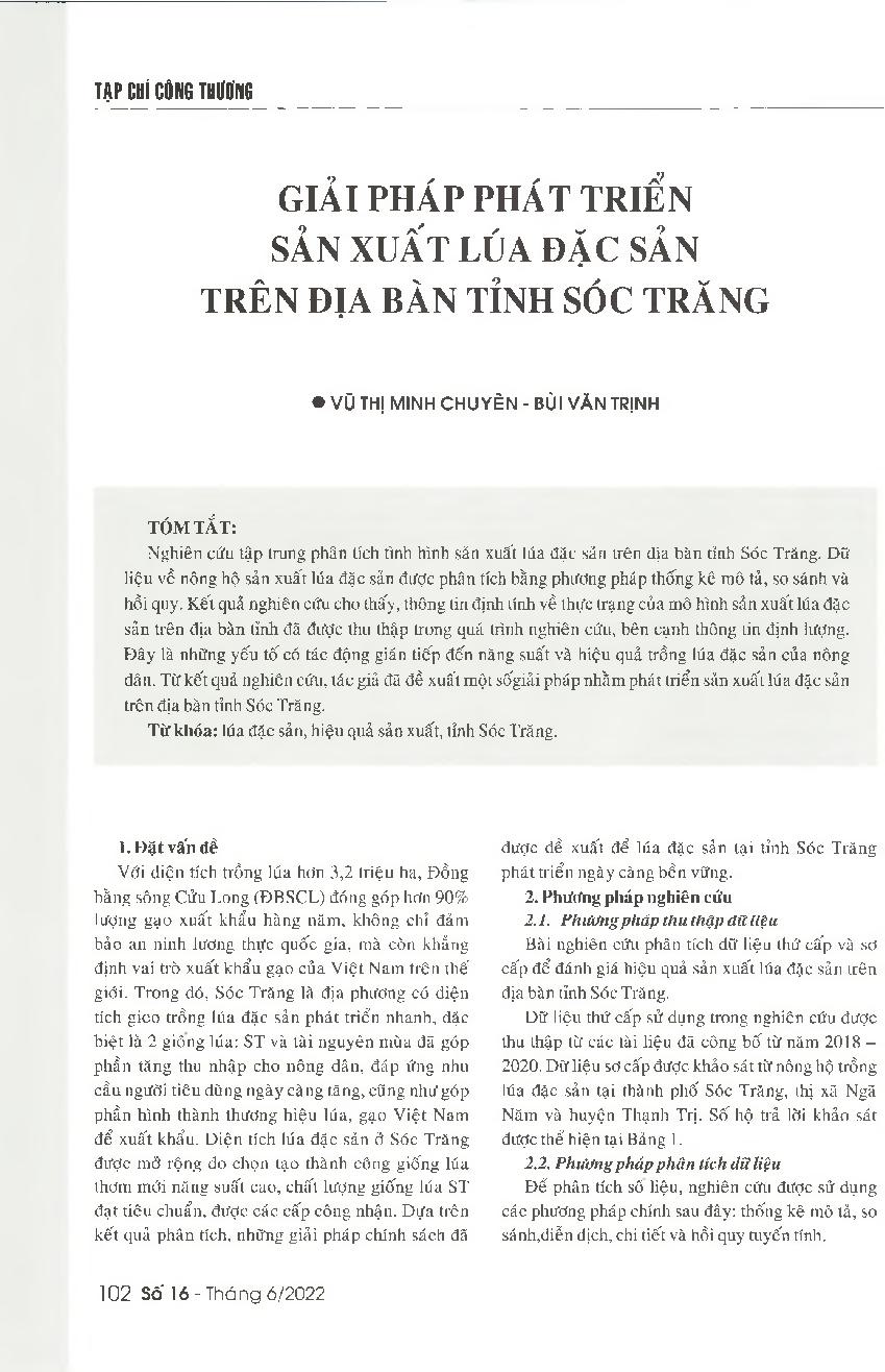 Giải pháp phát triển sản xuất lúa đặc sản trên địa bàn tỉnh Sóc Trăng = Solutions to promote the production of specialty rices in Soc Trang province
