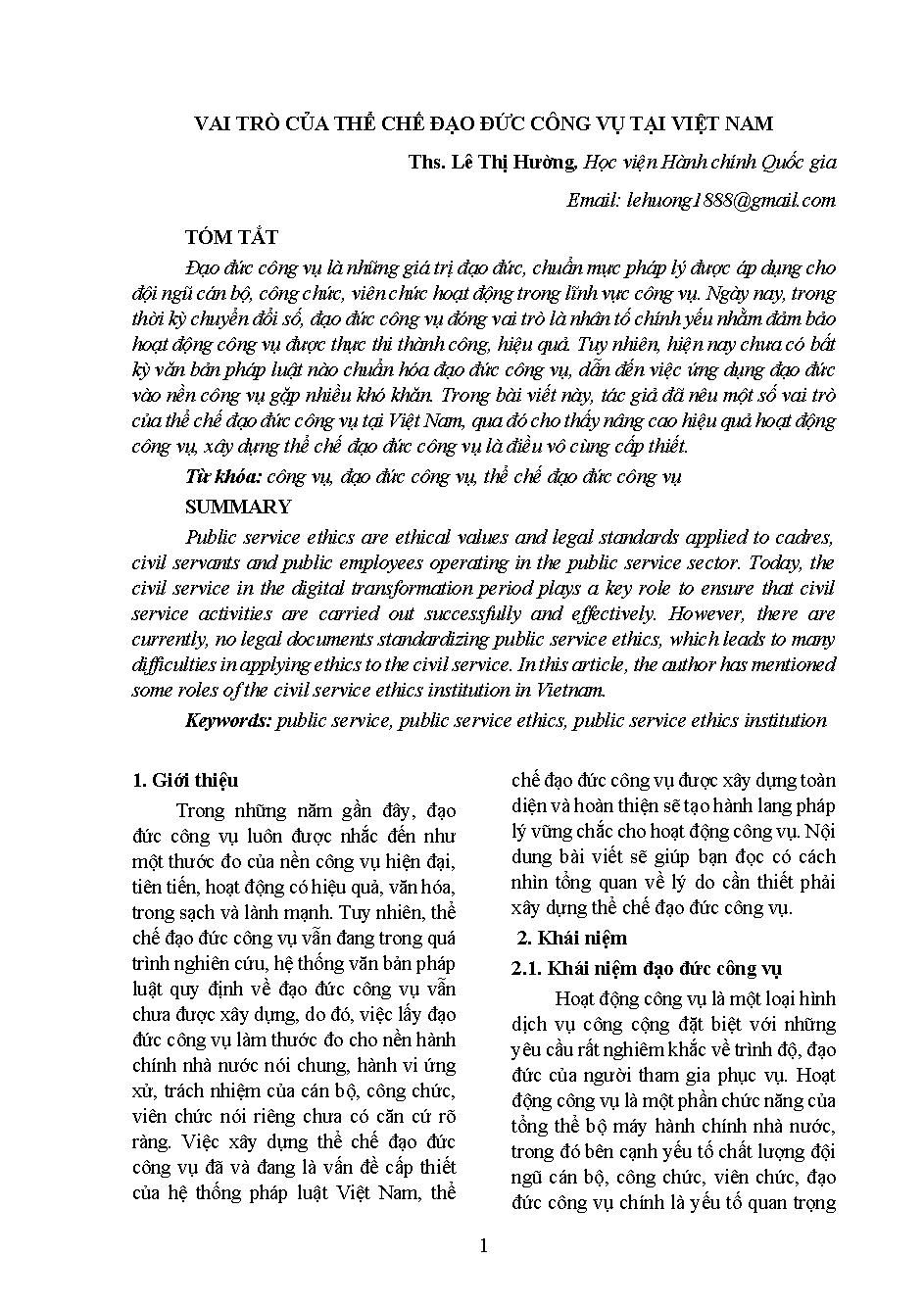 Vai trò của thể chế đạo đức công vụ tại Việt Nam = The role of public service ethics institutions in Vietnam