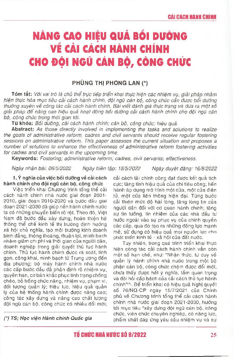 Nâng cao hiệu quả bồi dưỡng về cải cách hành chính cho đội ngũ cán bộ, công chức = Enhancing the effectiveness of administrative reform fostering activities for cadres and civil servants