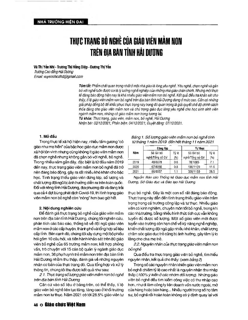 Thực trạng bỏ nghề của giáo viên mầm non trên địa bàn tỉnh Hải Dương = The reality of leaving the job from the preschool teachers Hai Duong province
