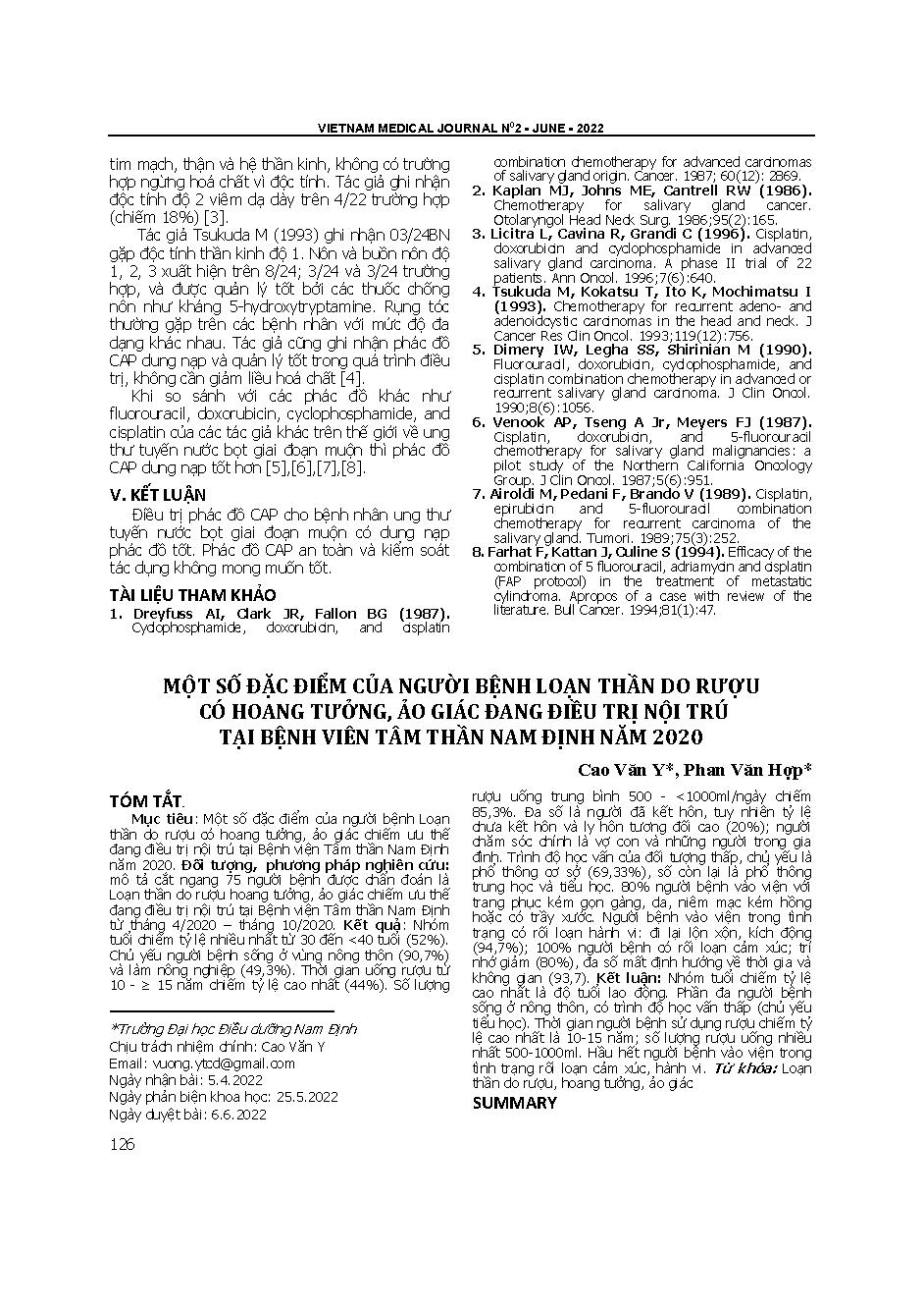 Một số đặc điểm của người bệnh loạn thần do rượu có hoang tưởng, ảo giác đang điều trị nội trú tại Bệnh viện Tâm thần Nam Định năm 2020 = The characteristics of alcoholic psychotic patients with paranoia and hallucinations undergoing inpatient treatment a