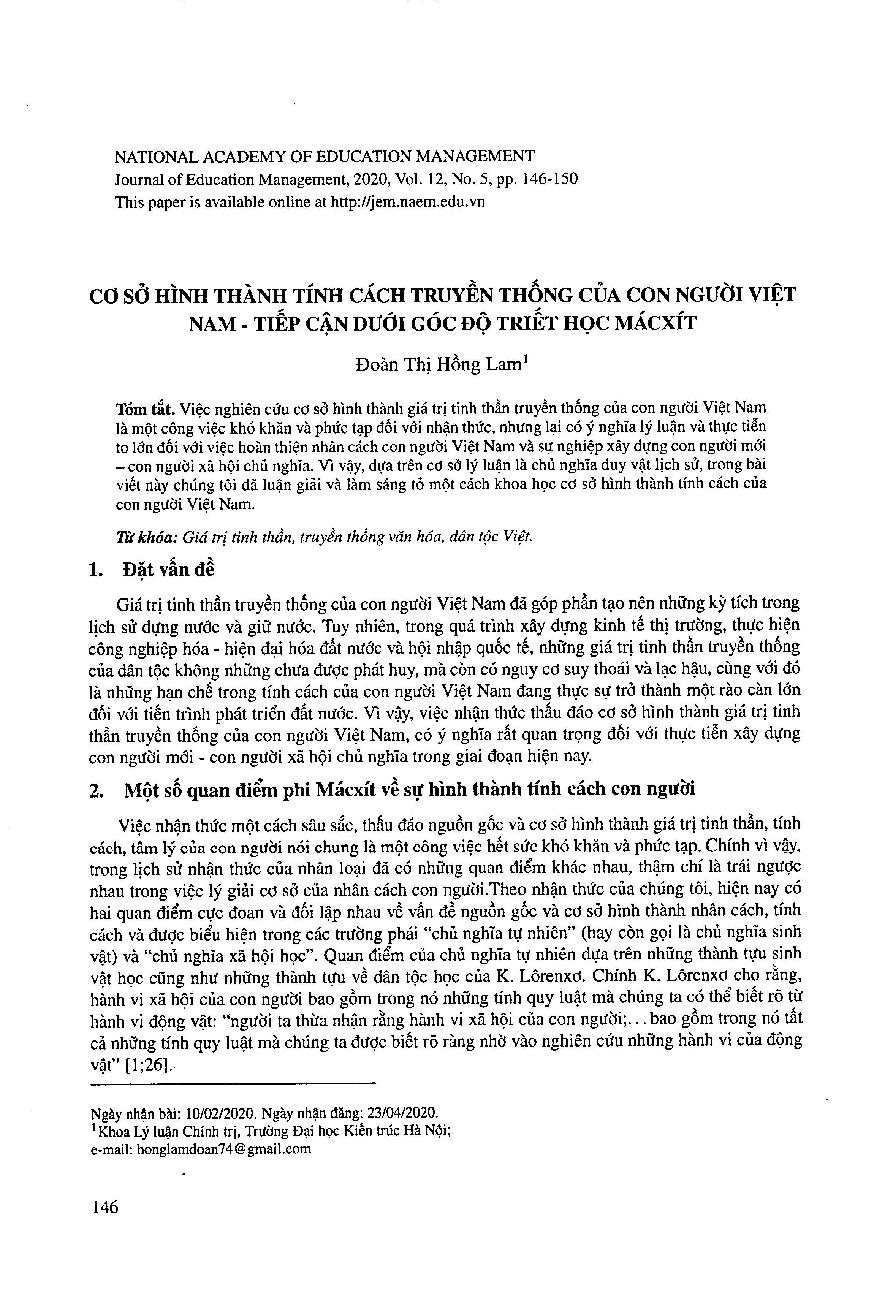 Cơ sở hình thành tính cách truyền thống của con người Việt Nam - tiếp cận dưới góc độ triết học mácxít = Foundation for forming the traditional spiritual value of Vietnamese people