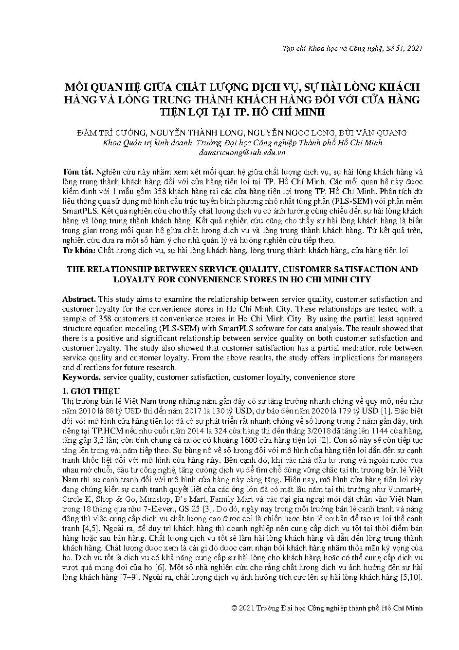Mối quan hệ giữa chất lượng dịch vụ, sự hài lòng khách hàng và lòng trung thành khách hàng đối với cửa hàng tiện lợi tại tp. Hồchí minh = The relationship between service quality, customer satisfaction and loyalty for convenience stores in ho chi minh city
