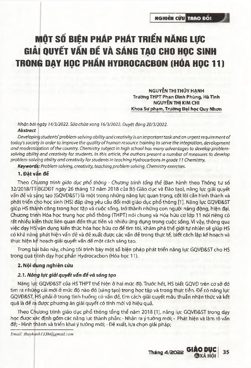 Một số biện pháp phát triển năng lực giải quyết vấn đề và sáng tạo cho học sinh trong dạy học phần Hydrocacbon (Hóa học 11) = Some measures to developproblem-solving ability and creativity for students through teaching Hydrocarbons in Grade 11 Chemistry.