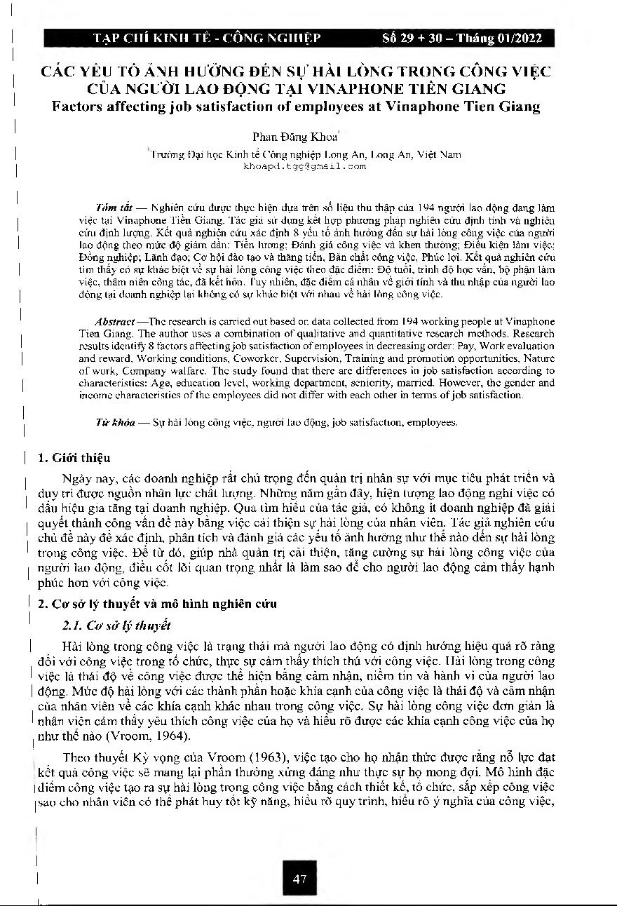 Các yếu tố ảnh hưởng đến sự hài lòng trong công việc của người lao động tại Vinaphone Tiền Giang = Factors affecting job satisfaction of employees at Vinaphone Tien Giang