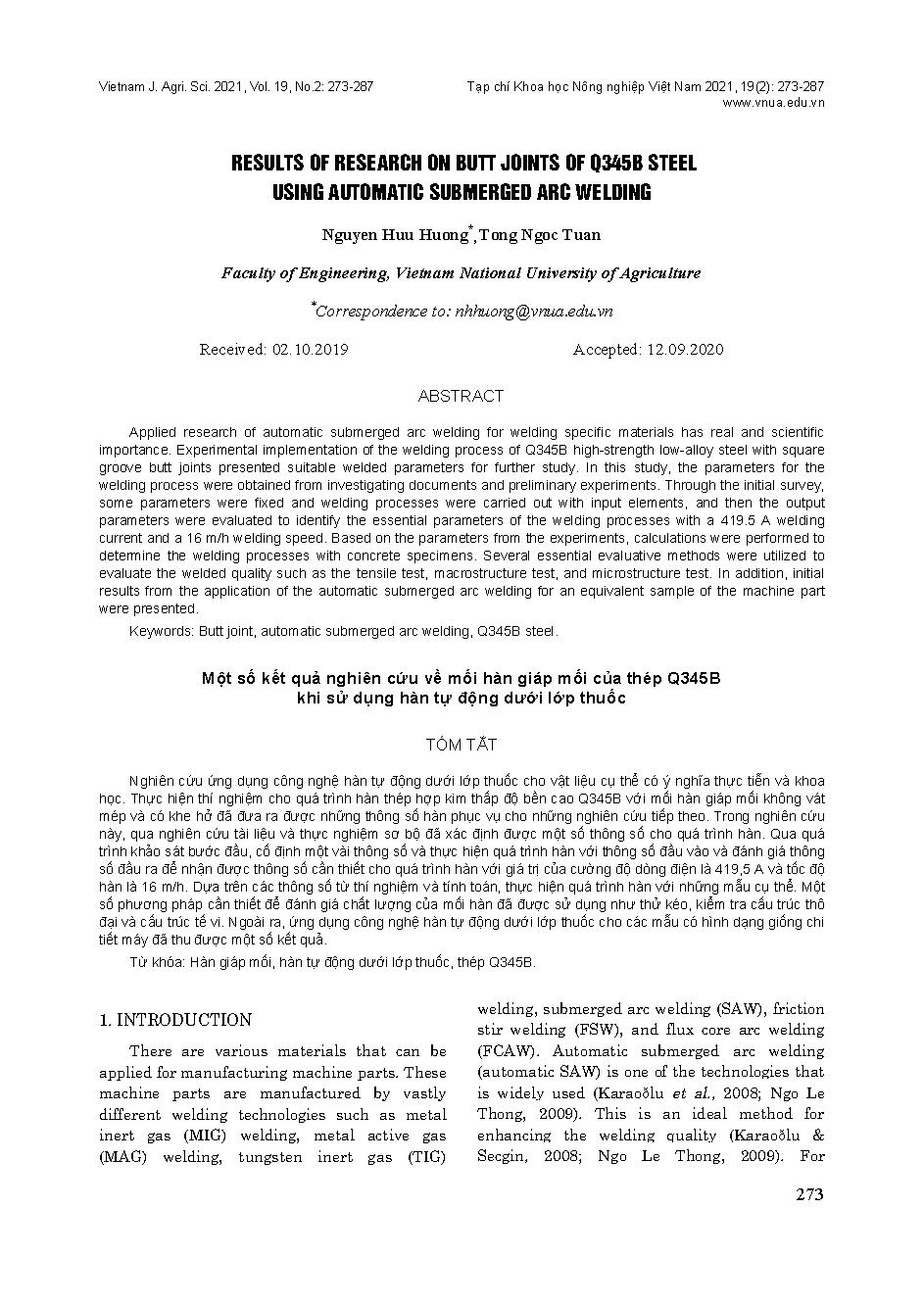 Một số kết quả nghiên cứu về mối hàn giáp mối của thép Q345B khi sử dụng hàn tự động dưới lớp thuốc