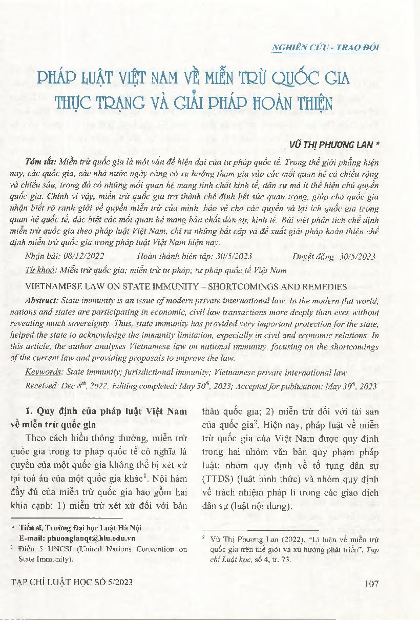 Pháp luật Việt Nam về miễn trừ quốc gia - Thực trạng và giải pháp hoàn thiện = Vietnamese law on state immunity - Shortcomings and remedies