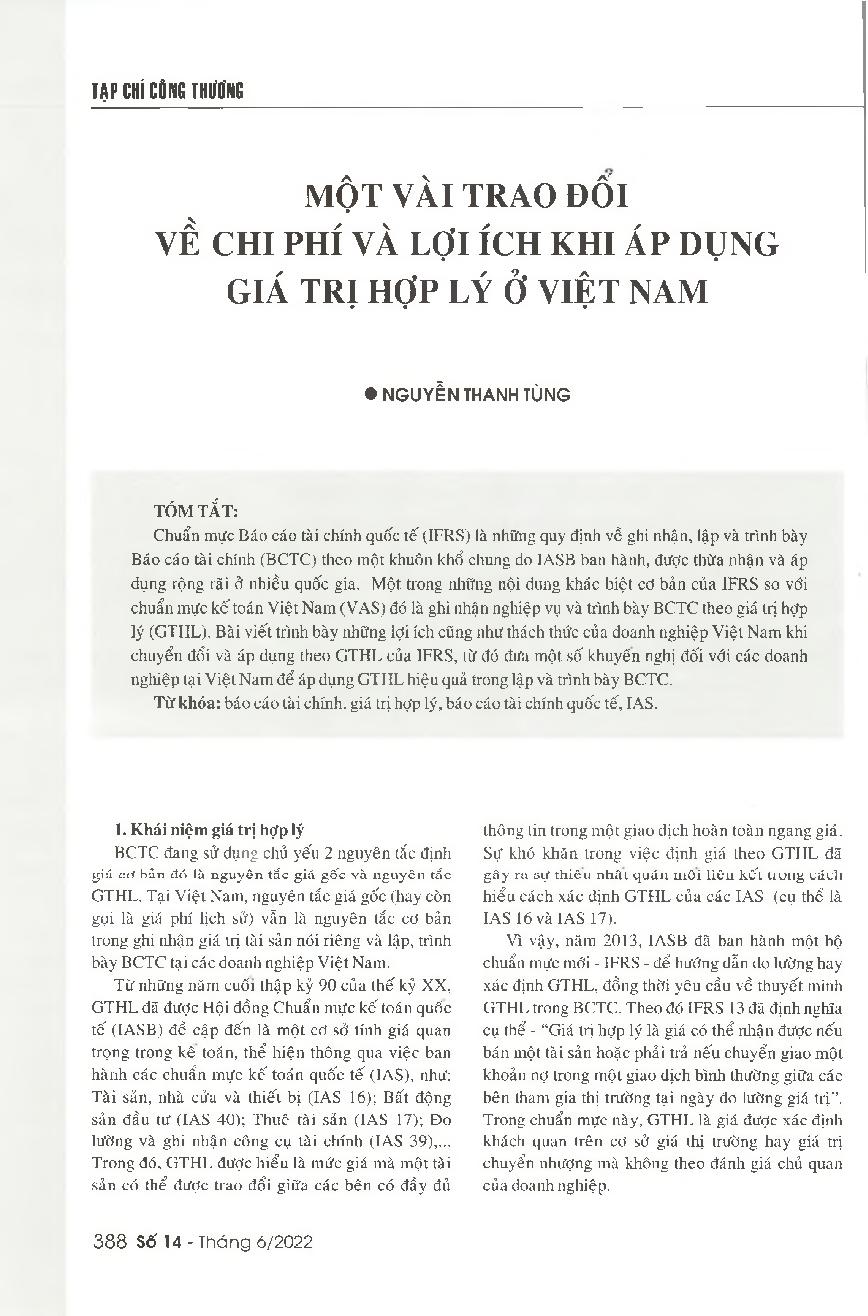 Một vài trao đổi về chi phí và lợi ích khi áp dụng giá trị hợp lý ở Việt Nam = Some discussions about the costs and benefits of applying the fair value standard in Vietnam