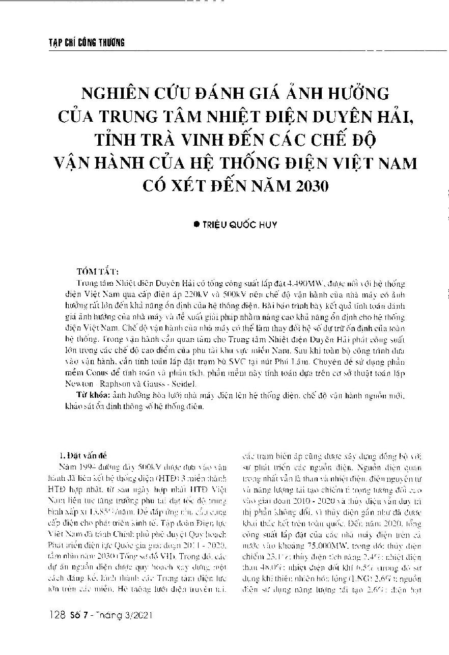 Nghiên cứu đánh giá ảnh hưởng của trung tâm nhiệt điện Duyên hải, tỉnh Trà Vinh đến các chế độ vận hành của hệ thống điện Việt Nam có xét đến năm 2030