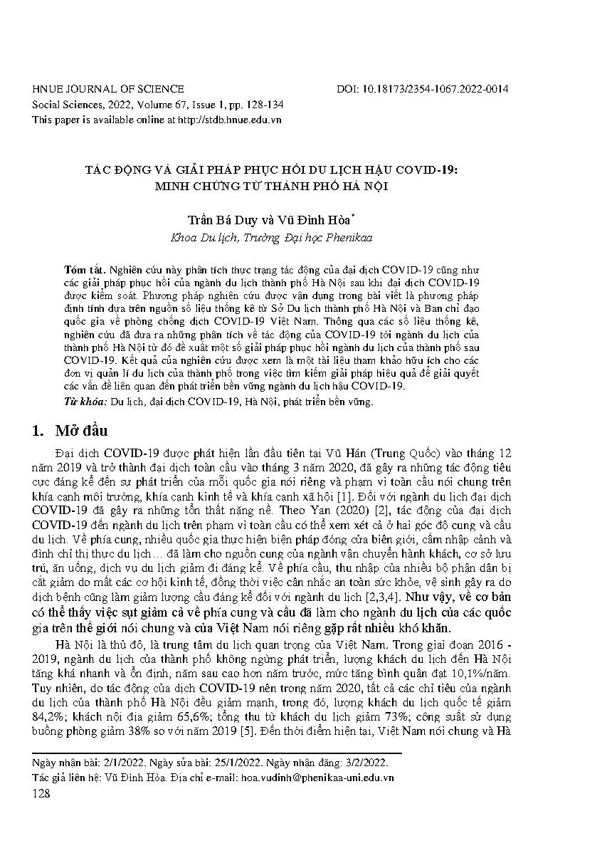 Tác động và giải pháp phục hồi du lịch hậu Covid-19: Minh chứng từ thành phố Hà Nội = Impacts and solutions for post-covid-19 tourism recovery: Evidence from Hanoi city