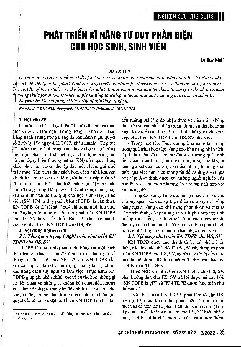 Phát triển kĩ năng tư duy phản biện cho học sinh, sinh viên = Developing critical thinking skill for pupils and students